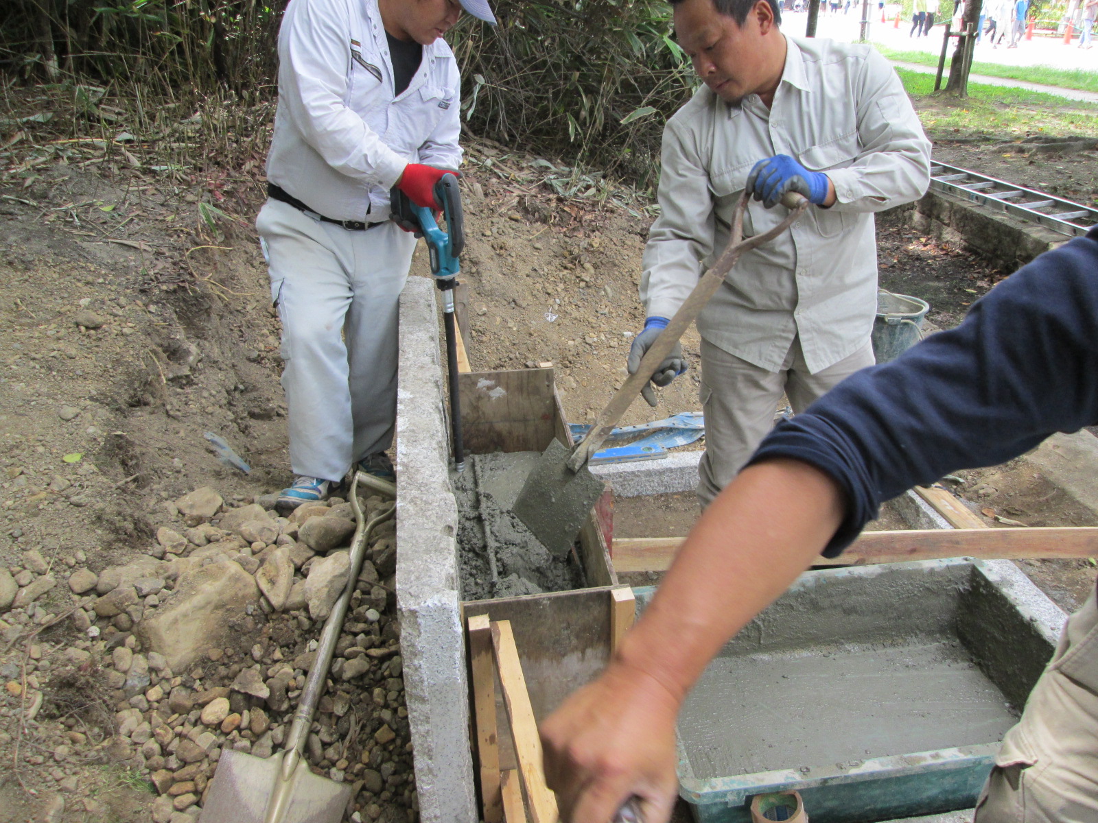 まずは法面だった箇所を掘削し、位置出しをして背板を設置しました。